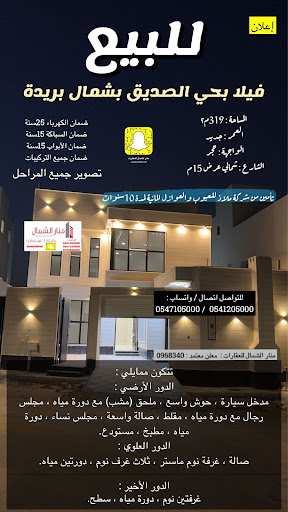 وكالات عقارات في السعودية – مكتب منار الشمال للاستثمارات العقارية. تعرف على العنوان ورقم الهاتف وساعات العمل والتقييم والآراء قبل التواصل أو الزيارة.